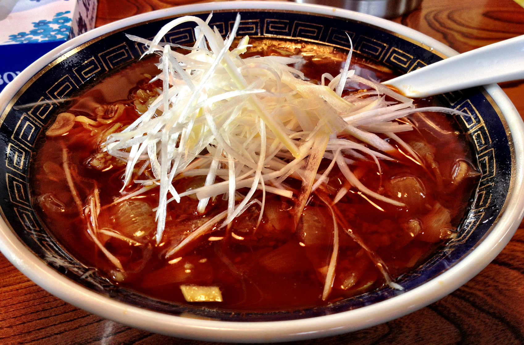 Bien que le tantan men soit déjà une belle découverte gustative en soi, nous allons nous intéresser ici à sa déclinaison locale dans le style Katsuura (ville éponyme de la préfecture de Chiba). Dans cette version, les nouilles sont servies dans un bouillon de sauce soja, auquel on ajoute généreusement de l’huile piquante japonaise (rayu), conférant ainsi au plat un caractère plus relevé, plus proche de la recette sichuanaise. Ici encore, on retrouvera de la viande de porc hachée, mais accompagnée cette fois-ci de lamelles d’oignons émincés.