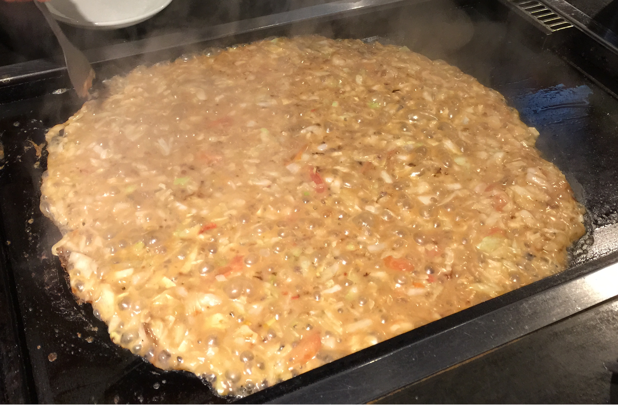 pour l’assaisonnement de sa pâte. La méthode de cuisson va aussi quelque peu différer : là où celle de l’okonomiyaki consistait (plus ou moins) à faire cuire l’ensemble des ingrédients en même temps, le monjayaki va nécessiter plusieurs étapes de cuisson. Notamment en faisant rissoler la garniture (viandes, légumes…) en premier, les disposer en cercle sur le teppan, avant de verser au centre la pâte au fur et à mesure, pour qu’elle cuise et s’incorpore aux différents ingrédients.