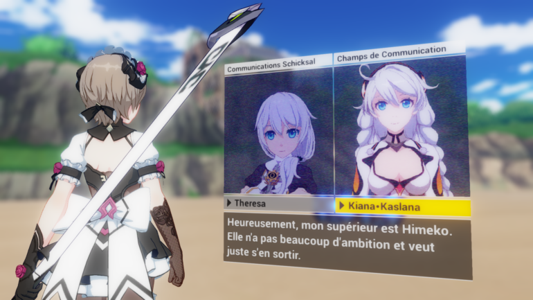 Vous aurez donc à votre charge Theresa Apocalypse, Kiana Kaslana, Kallen Kaslana, Raiden Mei, Yae Sakura, Bronya Zaychik, Murata Himeko, Fu Hua, Rita Rossweisse, Liliya Olenyeva, Rozaliya Olenyeva & Seele Vollerei. Je ne vais pas m’attarder sur chacune d’elles, mais sachez qu’elles sont toutes introduites à travers l’histoire principale et qu’elles ont droit à des chapitres annexes qui leur sont dédiés.