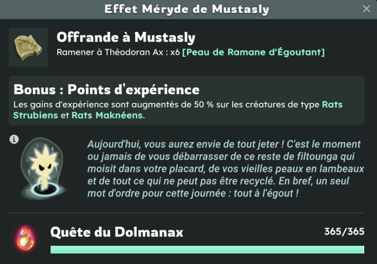Le projet a alors commencé officiellement le 1er septembre 2024. Une fois les ressources distribuées sur tous les personnages, il suffit alors… de faire la quête ! Nous étions encore sous la version 2.0 de Dofus durant le premier trimestre de mon projet, une journée d’offrande me prenait alors entre 16 et 22 minutes selon la pénibilité des dialogues en jeu.