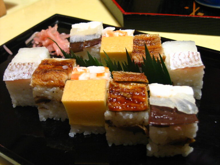 Les ingrédients sont placés au fond du moule en bois (nommé oshibako), recouverts de riz, puis compressés fortement avec un couvercle avant d’être découpés en bouchées sous forme de carré. Le Hakozushi est considéré comme une forme d’art culinaire, mettant en valeur la saveur du riz et de ses garnitures.